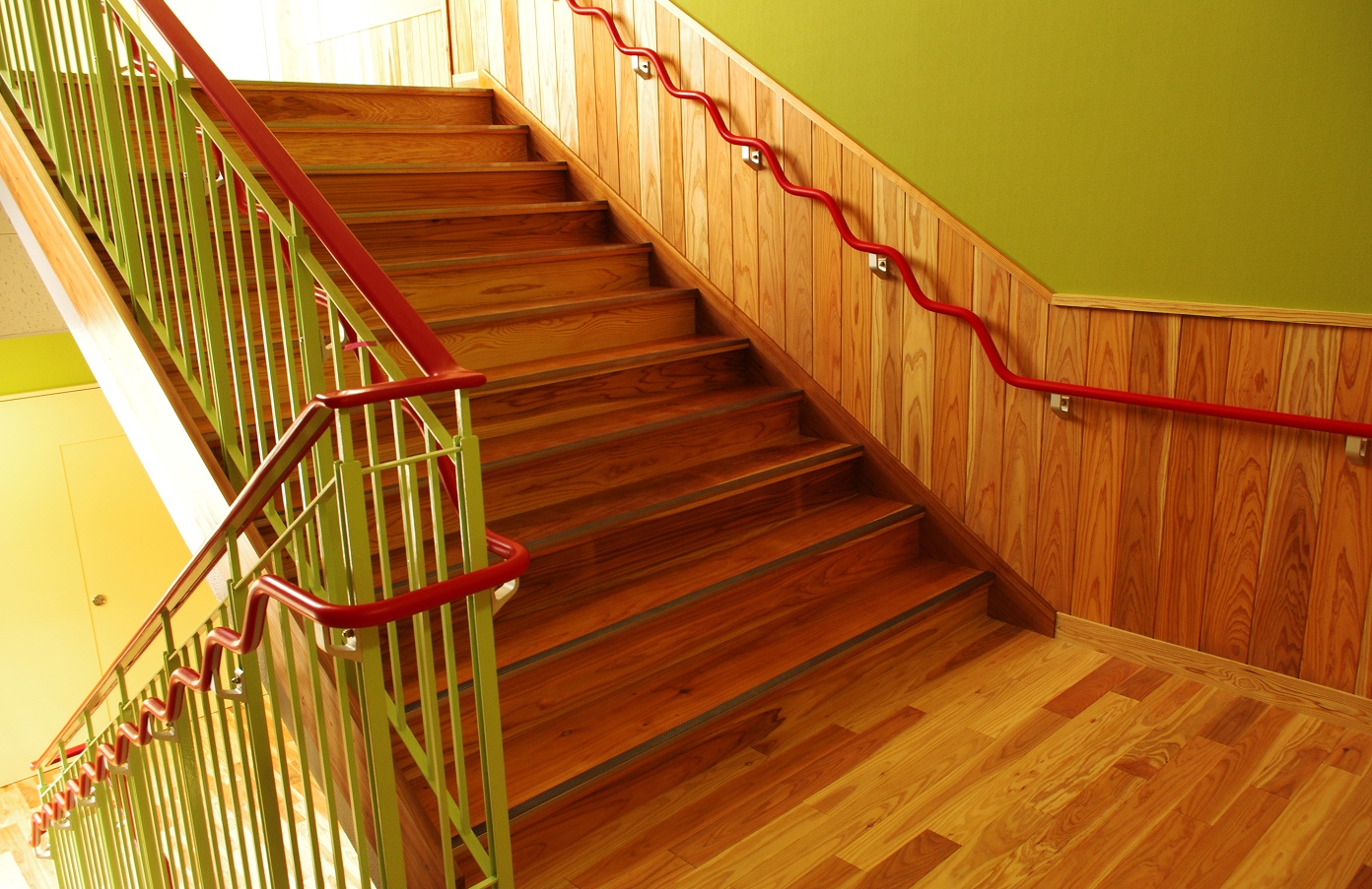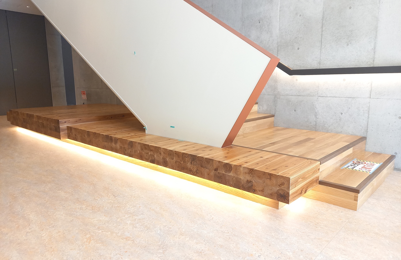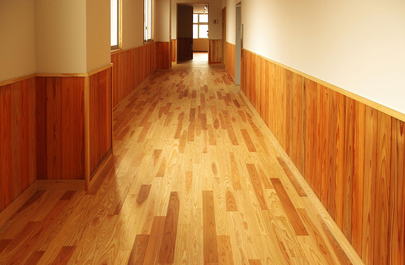 国産ならではの木目の美しさと質感をかもし出し重厚さを演出しました。文教施設、公共物件等に御使用出来ます。JAS認定工場