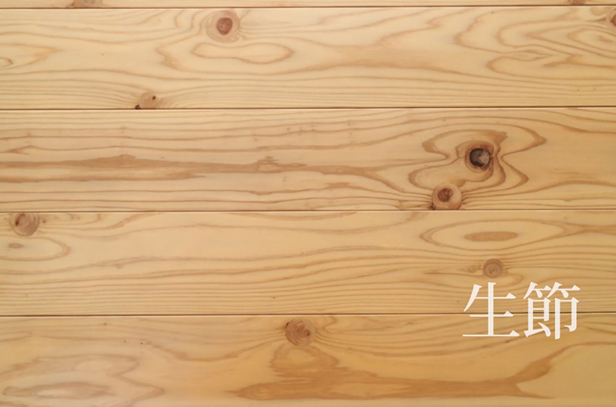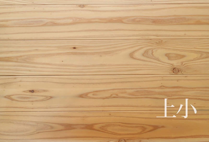 【上小節】一枚の材料に直径10mm以下の節が数個点在します。比較的白太が多くなります。